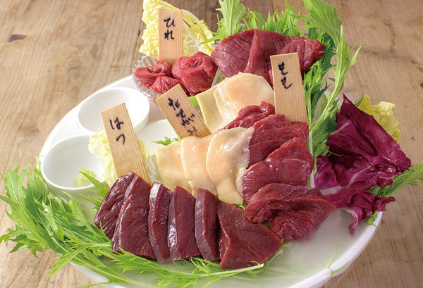 basashi4種盛り合わせL 2149円 それぞれ味に特徴のある4種の部位が楽しめる。生の馬肉の奥深さが体感できる看板メニューだ。