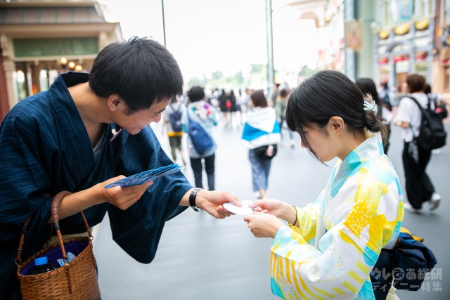 もらえる場所は、東京ディズニーランド、東京ディズニーシーともに、ウィッシングプレイス近くの、浴衣を着たキャストさんが配布(無料)しています。