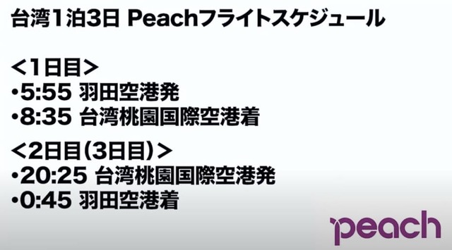 Peachの羽田空港発5:55の早朝便で台湾桃園国際空港に向かい、帰りは20:25便で出発。羽田空港には翌0:45に到着します。少しだけ日を跨いでしまうので、1泊3日の旅程に。