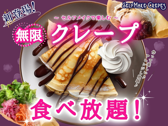今回登場の「クレープ食べ放題」では、専用のクレープメーカーで簡単に生地を焼き上げ、ホイップクリームや、マンゴー、チョコバナナ、ミックスベリーなどのフルーツを好きなだけトッピングすることができ、何度でもアレンジを試すことができます。デザートクレープだけでなく、サラダを巻いて『おかずクレープ』にチャレンジしたりと、無限にクレープを楽しむことができます。