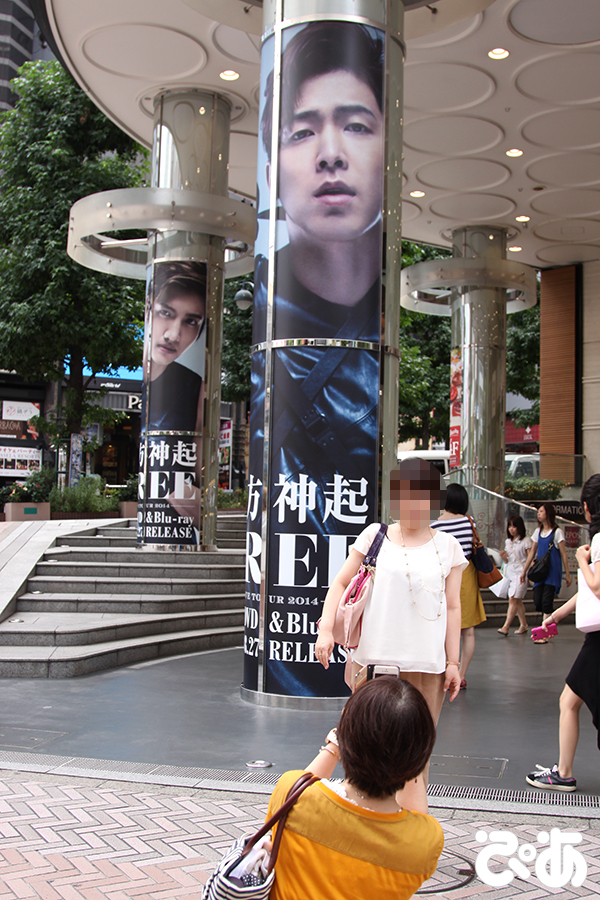 そのひとつ、マルイシティ渋谷店では、店舗の外壁に大幕と、店頭の柱にユンホとチャンミンの等身大以上の巨大ポスターが展示され、行き交う人の目を引いている。