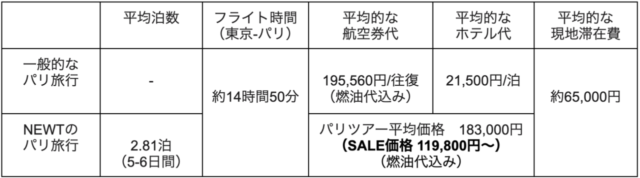 一方、NEWTでパリ旅行を予約すると、ツアー代金(航空券+ホテル代)の平均は約18.3万円(おとな1名料金/燃油代込み)。さらに、NEWTでは、セールを活用すれば、ツアー代金が10万円以下で行けることも。