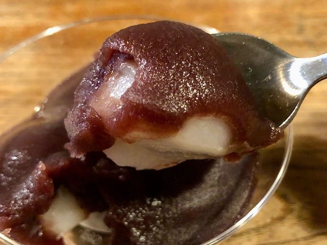 早速スプーンを餡子に突き刺し、あんころ餅を掬い上げて口に運んでみました。お餅もこし餡も滑らかな食感で舌触りが良く、するっと美味しく食べられちゃいますね。