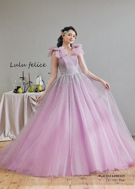 美しいグリッター柄が引き立つ、ロマンティックな大人のカラードレス。