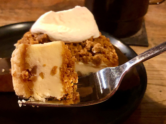 ザクザクのクランブルはシナモンとカルダモンが効いており、しっかり風味を感じられます。クランブルは控えめな甘さで、爽やかな酸味がチーズケーキとよく合います。