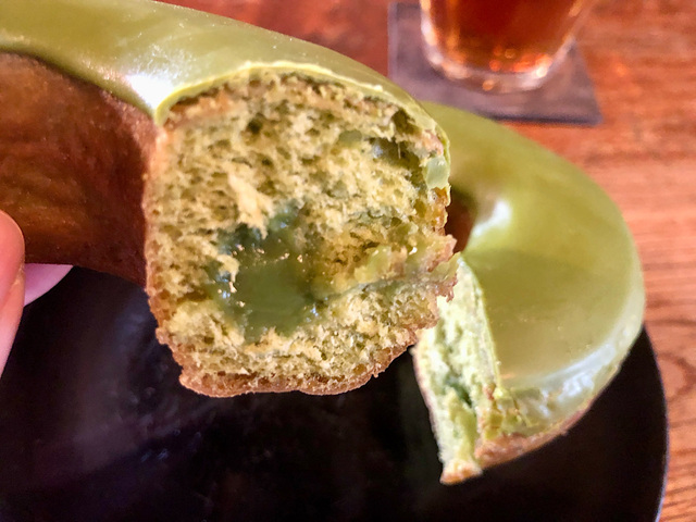 ドーナツを口に運ぶと、しっとりとしたドーナツ生地と、なめらかな抹茶クリーム、パキッとした抹茶コーティングの食感を楽しめます。