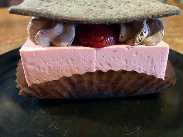 ストロベリームースとチョコレートソースが美味しく、舌の上でとろけながら味わえるのがいいですよね。食べ進めて、ストロベリーソースと一緒にムースを食べると、チョコレートソースとは違ういちご感の強い美味しさを味わえるのもまた良い!