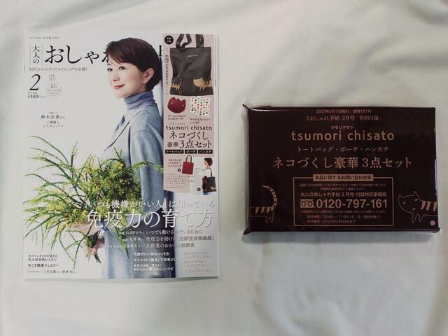 宝島社から2025年1月7日に発売された雑誌『大人のおしゃれ手帖』2月号の付録は、ツモリチサト(tsumori chisato)コラボの「トートバッグ・ポーチ・ハンカチ」です。