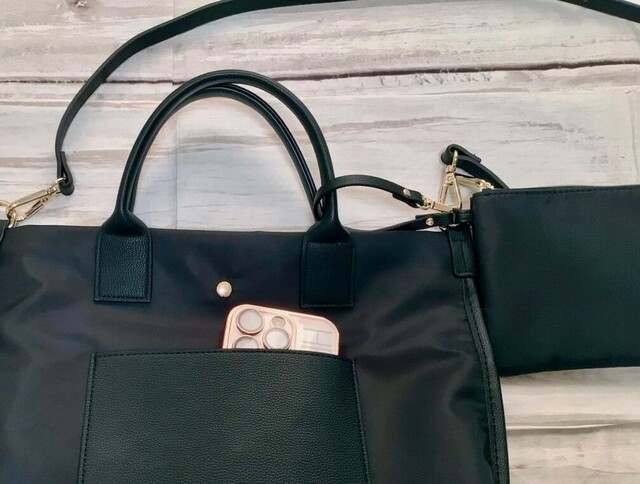 異素材の組み合わせがスタイリッシュなデザインで、豊富なポケット&ショルダーストラップ、チャームポーチ付きで機能性も抜群!