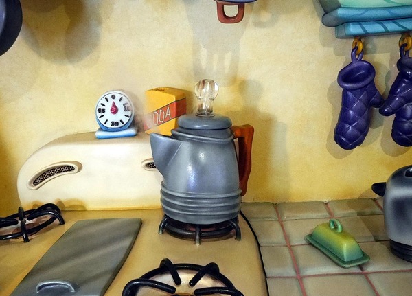 様々なものが置いてあるこのキッチン。オーブンの上にはお湯を沸かすポットが置いてあります。その下にある点火スイッチをひねると、ちゃんとポットのお湯が沸きます。