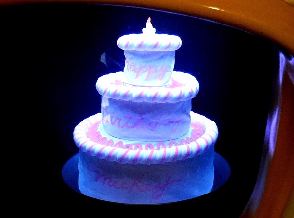 ほんの短い一瞬だけなので、注意して見ていないとわからないのですが、焼かれて膨らみきったケーキをよく見てみると、そこには上の段から「Happy」「Birthday」「Mickey」と書かれているのがわかります。