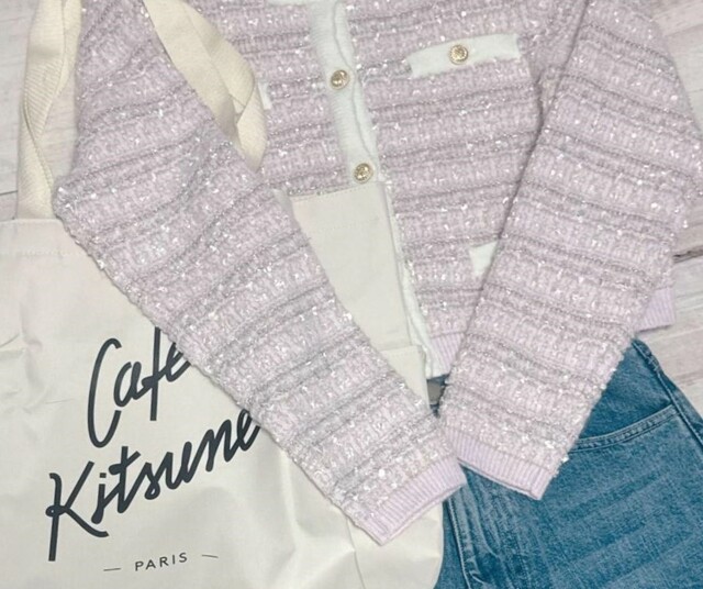 ・ピンクのツイードニットカーディガン×ワイドデニム