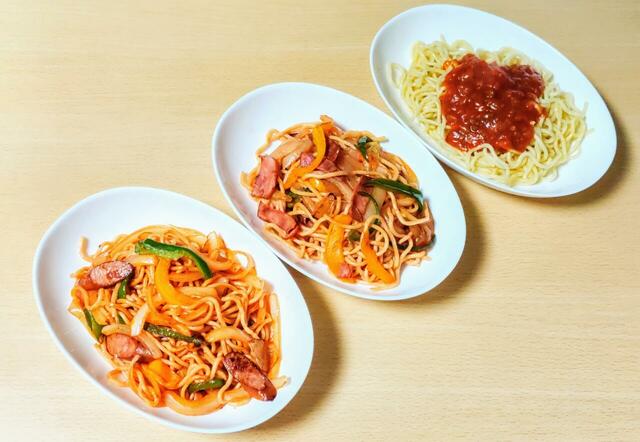 調理方法は、フライパンで具材を炒めてから、麺と水を加えてさらに炒め、ソースをかけて混ぜれば完成。ミートソースのみ、ソースを湯煎する必要があります。