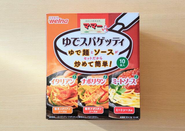 最後にご紹介するのは「マ・マー ゆでスパゲッティ」です。イタリアン、ナポリタン、ミートソースの3種類が入っており、ゆで麺と各種ソースがセットになっていますよ。