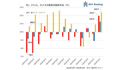 クロモノ家電の年末商戦が勢いを取り戻してきた。2024年12月のPC、テレビ、カメラの販売台数前年比が、揃って2桁増を記録した。20年に始まったコロナ禍特需や反動減などによるイレギュラーな市場の動きが、ようやく正常化し始めている。全国2400店舗の家電量販店やオンラインショップの実売データを集計するBCNランキングで明らかになった。 24年12月のPC(ノート、デスクトップ)の販売台数前年比は119.7%を記録。不発に終わった一昨年の年末商戦の反動ともいえるが、久々に2桁の伸びを示した。24年のパソコン市場はおおむね前年割れ基調で推移。しかし秋口からAI PCの登場などによって市場が活性化してきた。12月の販売台数としては、21年、22年に比べれば、まだ1割程度下回っているものの、年末商戦では勢いが戻ってきた。昨年12月の販売台数シェア上位のメーカー別でみると、トップはシェア17.9%の富士通。12月の販売台数前年比は91.8%とわずかに前年を下回った。シェア17.8%で2位のNECは104.0%と微増にとどまっている。しかし、14.0%でシェア3位のASUSは119.6%と2桁増。11.6%で4位のアップルは167.2%と大幅増、10.9%で5位のレノボも130.4%と大幅に伸びた。