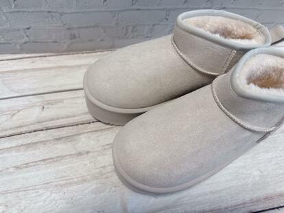 人気のUGGの「クラシック ウルトラ ミニ プラットフォーム」風のショート丈デザインで、フラットな厚底仕様。