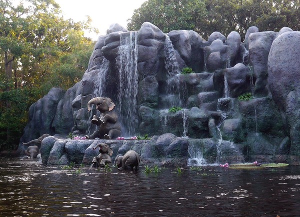 神殿を抜けた所にあるインド象の水浴び場。ここには植物が加わり、陽気な音楽とともに華やかな雰囲気になりました。