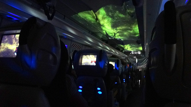 宇宙の旅が始まると、前方のモニターだけでなく天井や側面の窓(のようなモニター)にまで宇宙の映像が。キラキラと輝く星々が流れていきます。