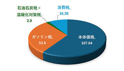 また、ガソリン代と言えば複数の税金が掛けられているのは有名な話だが、「その内訳は?」と言われるとなかなかイメージしにくい。例えば、1リットル180円の場合、本体価格はわずか約107円だ。これに、ガソリン税が約54円、石油石炭税+温暖化対策税が約3円が加わり、合計164円に消費税の16円が加算され、180円となっている。ちなみにガソリン税は、本則28.7円と暫定の25.1円から成り立っているが、暫定の具体的な終了時期は決まっていない。