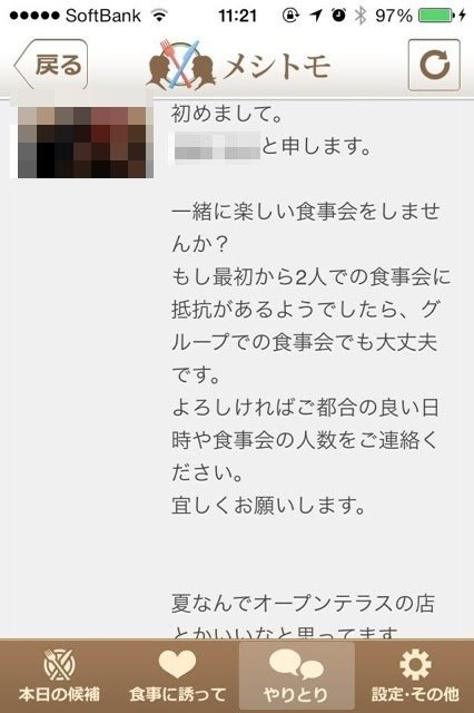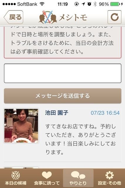 ただ、そのメッセージが来る前に、男性(以下Aさん/31歳/不動産関連)から普通にオファーが来ていたため、Aさんと食事に行くことにしました。4~5通ほど日時やお店などを決めるやりとりをしていよいよ当日。