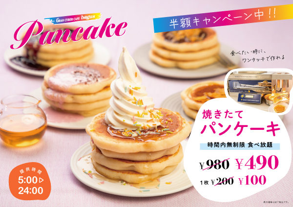 インターネットカフェ「グランサイバーカフェ バグース池袋店」が2025年1月20日(月)より、世界で唯一の自動パンケーキマシン「POPCAKE(R)」を導入。これを記念して、1月31日(金)までの期間限定で「通常食べ放題980円・単品200円」のパンケーキを半額で利用できるキャンペーンが実施されています!