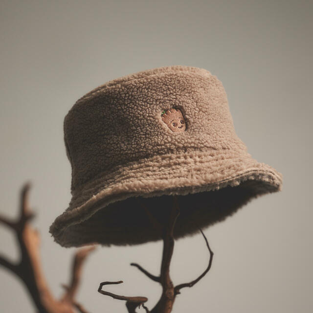 バケットハットは、グルートのカラーで、顔がワンポイントでデザインされています。