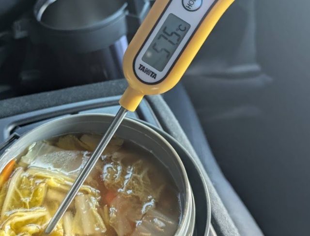 朝5時半頃にスープをランチジャーに詰め、12時に温度を確認したところ57.5℃でした。しっかり保温されていますが、サーモスの品質表示では6時間で保温効力68℃以上とのことなので、スープを入れる前に容器を予め温めておくと、もう少し保温効果が高まりそうです!