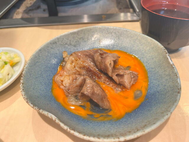 まずは卵に浸さず、肉だけでいただいてみると……お肉のクオリティが高すぎて、シンプルな醤油と砂糖だけで大正解!「余計なモノは要りません!」と一気に幸せを感じました。肉本来の旨味がしっかり味わえる、贅沢な一口です。