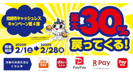 鹿児島県枕崎市は2月1~28日まで「枕崎の飲食店等を応援しようキャンペーン 第4弾!!」を開催する。対象の店舗でau PAY(コード支払い)、d払い、PayPay、楽天ペイ(コード/QR/セルフ払い)、Payどんのキャッシュレス決済で支払うと、最大30%のポイントを還元する。