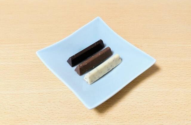 本品のチョコは、ひと口サイズで棒状&三角形なのが特徴です。またダーク味にはパールシュガー、ミルク味にはカカオニブ、ホワイト味にはライスパフが散りばめられているのもポイント。