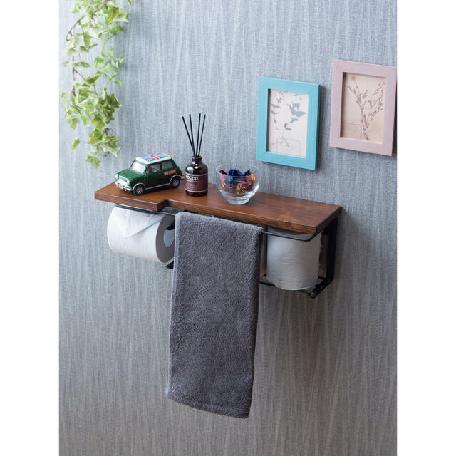 天然木×スチールの組み合わせが格好良い、ストックラック付きのトイレットペーパーホルダー「トイレをオシャレに!ストックラック付きトイレットペーパーホルダー」。