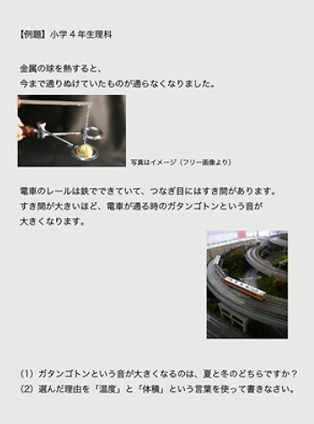 この問題の狙いは、設問の冒頭から「金属の体積は温度が低いと小さくなり、高いと大きくなることを理解し、電車とレールのすき間と音の関係を考え、表現する」というもの。