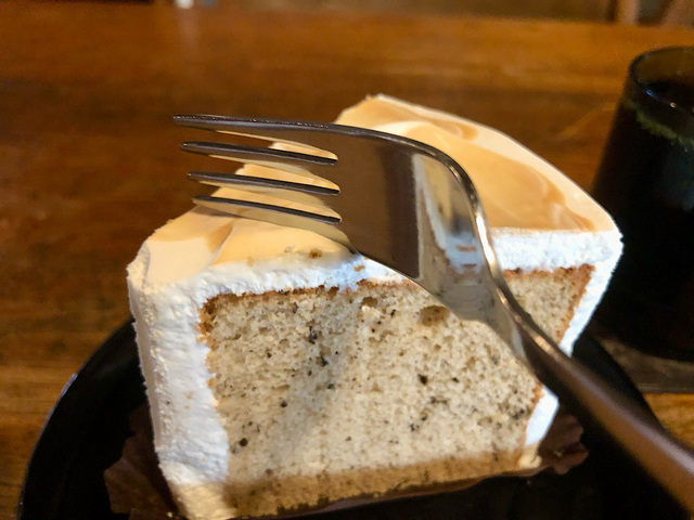 一口食べると、ふわふわのシフォン生地と、なめらかな紅茶クリーム&ホイップクリームの食感のバランスが絶妙で、口の中で優しく広がる紅茶の風味が心地よく感じられます。まさに贅沢なおやつタイムにぴったりな一品です!
