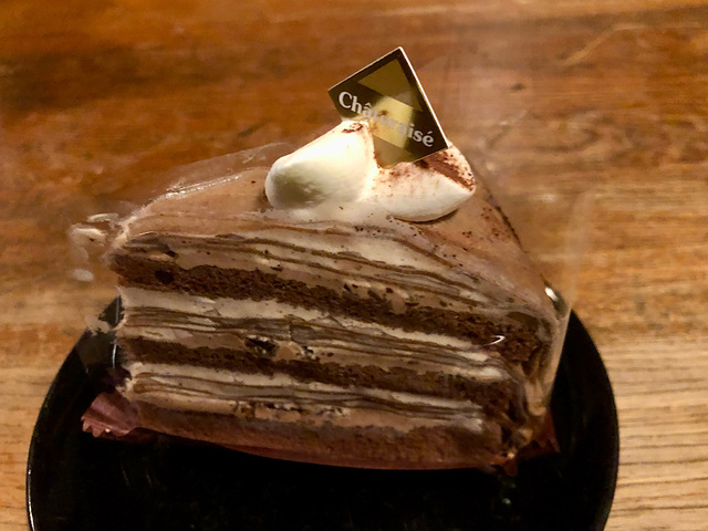 ブランデー入りのシロップを染み込ませたココアスポンジと、パリパリ食感の削りチョコレートも挟まれています。濃淡さまざまなチョコ色のミルクレープの天面にちょこんとのった白いホイップクリームの見た目が可愛らしいですね。
