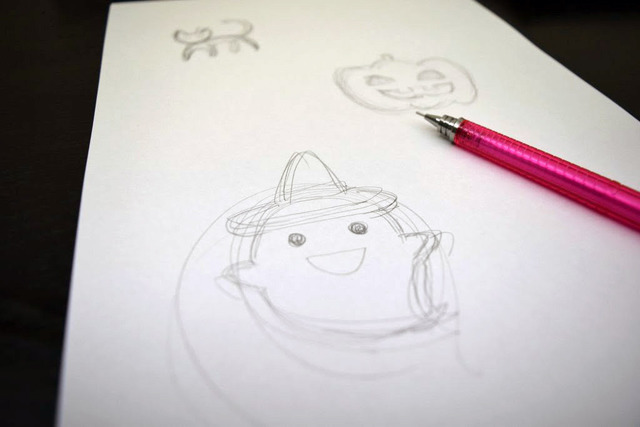まず鉛筆で絵を描いて、そのあと見やすいように太いマジックなどで主線をなぞります。今回は、ハロウィンに活躍する黒猫やオバケ達をを描いてみました。あとでリボンを通して、部屋に飾る予定。