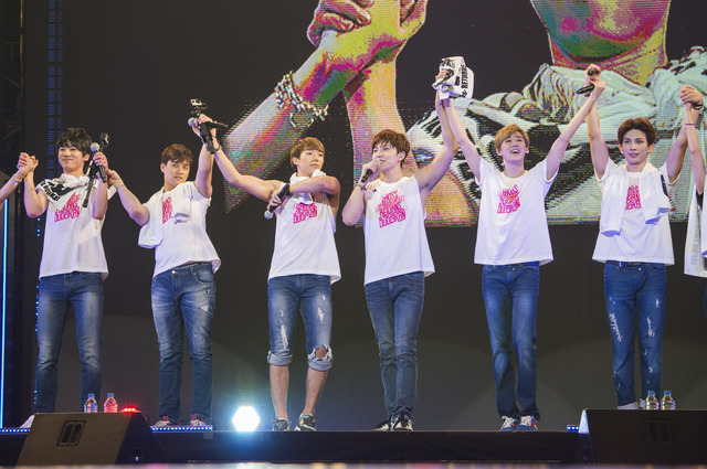 中盤からは、ジュンも参加し、6人でのパフォーマンスで沸かせた。全国ツアーで実施されたファン投票で1位になった韓国楽曲『キブリジマ(媚びるな)』を日本で初披露。女性ダンサーと絡む、セクシーなダンスでファンの嫉妬心を煽った。