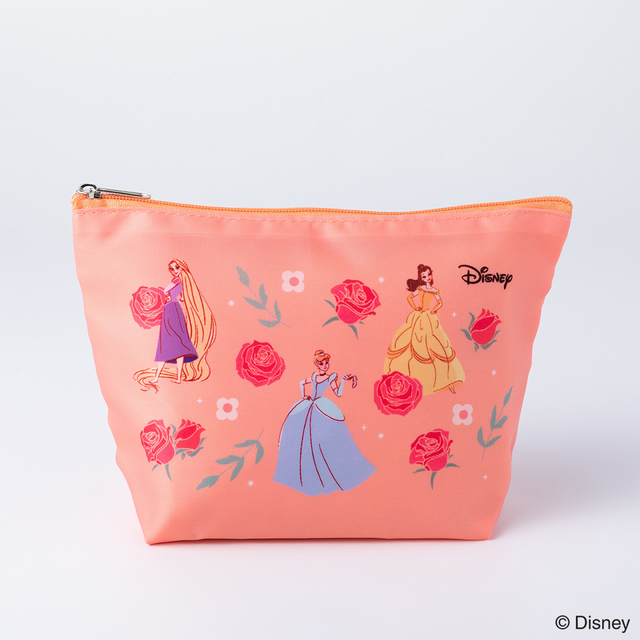 シンデレラ、ベル、ラプンツェルが集合した、サーモンピンクのポーチです。