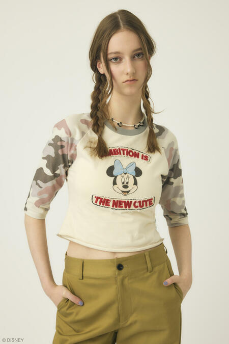 大きな青いリボンをつけた、レトロスタイルのミニーを大きくプリントしたTシャツは、ヴィンテージ感のあるタイニーサイズな6分丈袖。