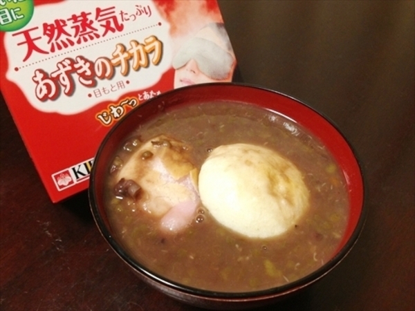 レンジで温めると温かい蒸気が発生し、目の上に置けば温熱効果で疲れ目を癒してくれる「あずきのチカラ」。そのあずきをおしるこにしてみるというこの実験。