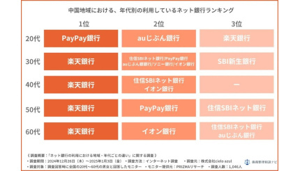 利用しているネット銀行ランキング全地域で楽天銀行が1位に。一部地域の若年層ではPayPay銀行が逆転