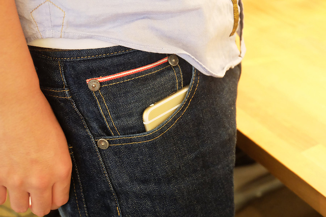 大きくなったとはいえ、ジーンズのポケットには難なく収まるiPhone 6 Plus。持ち運びについては気にならないサイズ。 拡大画像表示