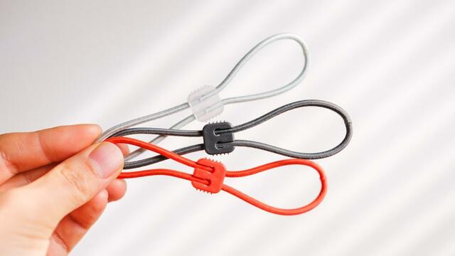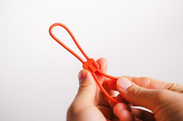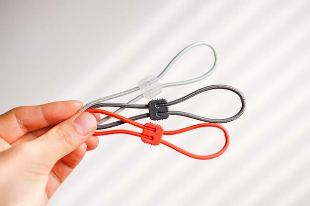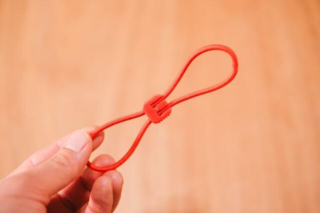 使い方はシンプルで、ゴムバンドの片側の輪っかに通してから、ストッパーをギュッと絞るように動かすだけ。