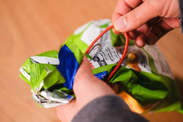 このアイテムの魅力は、お菓子の袋やコード類をササッと留められること、そして2パターンの留め方があるところにあります。
