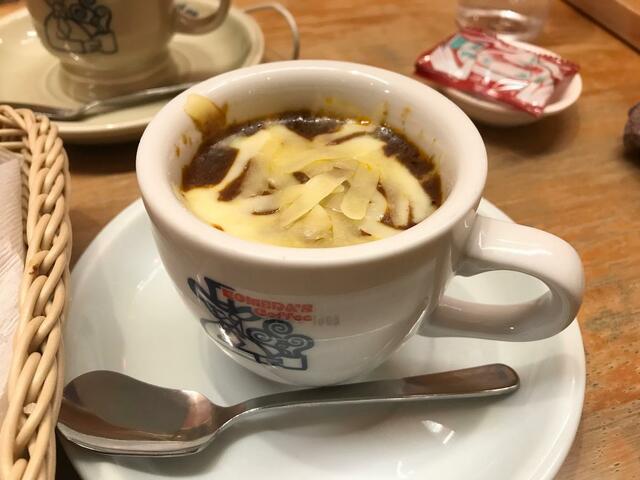 普段は、朝11:00までのモーニングをいただくことが多いのですが、この日は「チーズカリートースト」を頼んでみました。カウンター席のとなりに座っていた老紳士が注文していて、とっても美味しそうだったのでつられて頼みました。