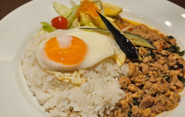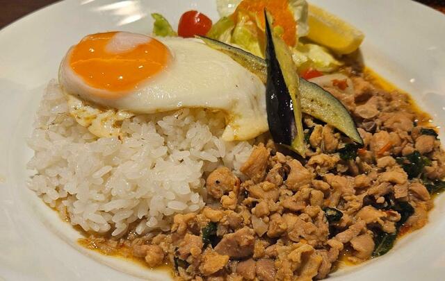 粗めにカットされた鶏肉に香辛料が効いていて、タイ料理好きにはたまらない一皿。