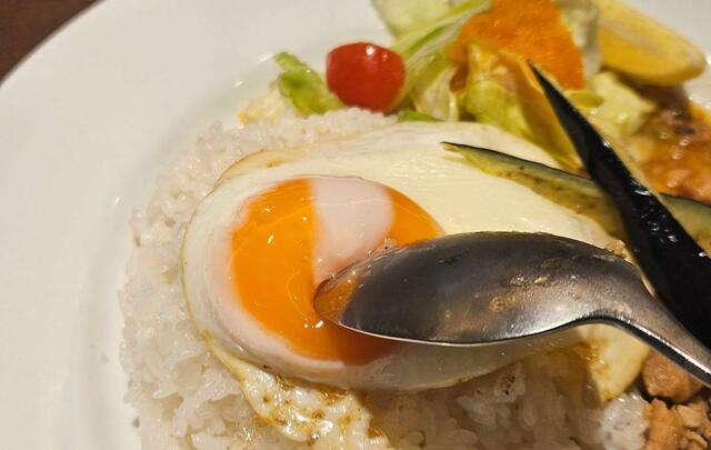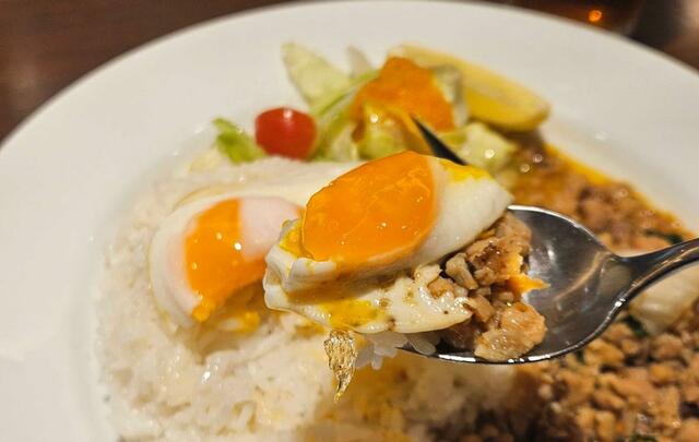 お肉とごはんを黄身をいいバランスでスプーンでとって食べるのが最高です!