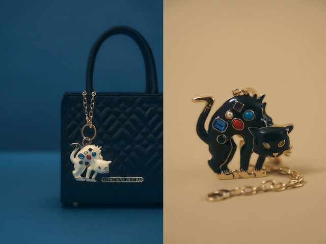 毛を逆立てた猫のデザインが可愛いバッグチャーム「チャーム イルゼキャッツ」は、オフホワイトとブラックの2色展開です。美しい植物や宝石が自然と身体に付いていった作品内の猫の様子がカラフルなストーンで表現されています。