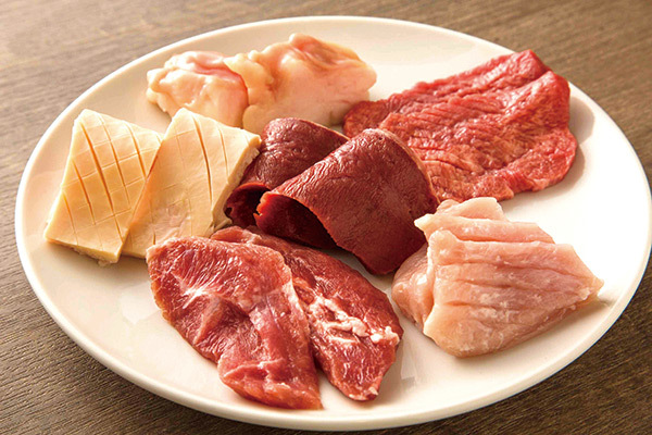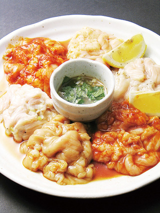 和牛ホルモン6点盛り(3人前) 1420円 脂付きシマ腸を含む極上ホルモン6種類の味が楽しめる。どのホルモンもタレとの相性が抜群。