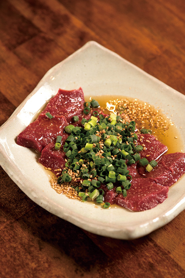 ハツ刺し 500円 ゴマ油とネギが絶妙な塩加減のハツとベストマッチ。ぐいぐいお酒が進んでしまう逸品だ。 拡大画像表示