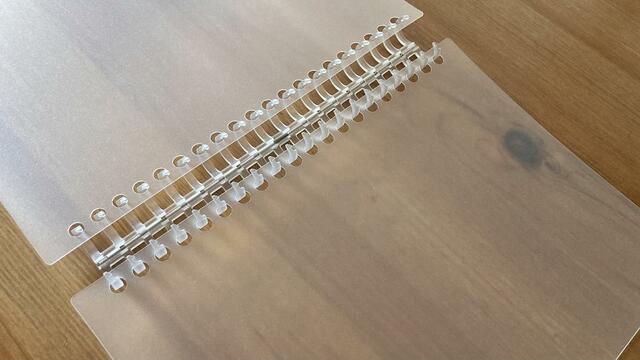 表紙は、耐久性重視で半透明のポリプロピレンを選びました。ダークグレーとベージュの厚紙タイプもありましたが、持ち歩いて使いたいので、多少の水気や汚れにも強い素材に。